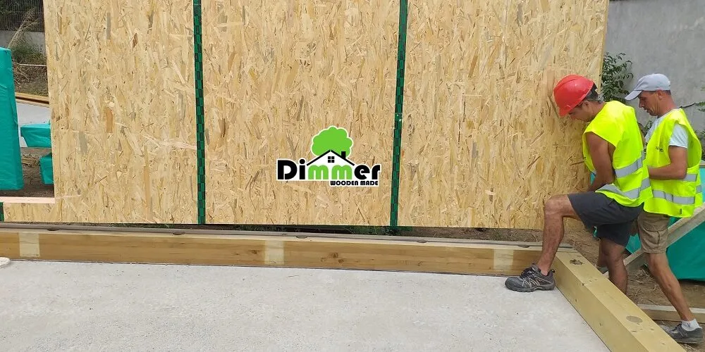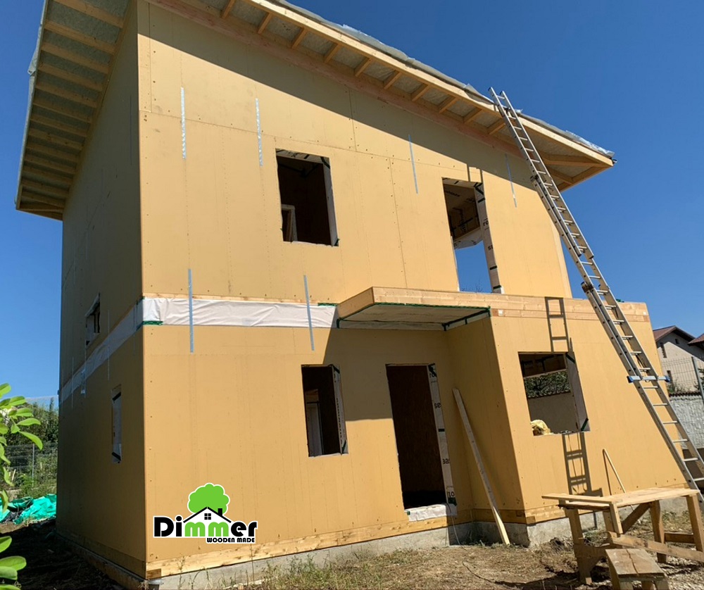 O altă caracteristică a acestei casa este acest panou DHF. Este un panou special care permite migrația vaporilor accidentali din structură către exterior. Permite oarecum o ușoară “ventilație” a peretelui prin DHF și vata bazaltică care va fi montată pe exterior.