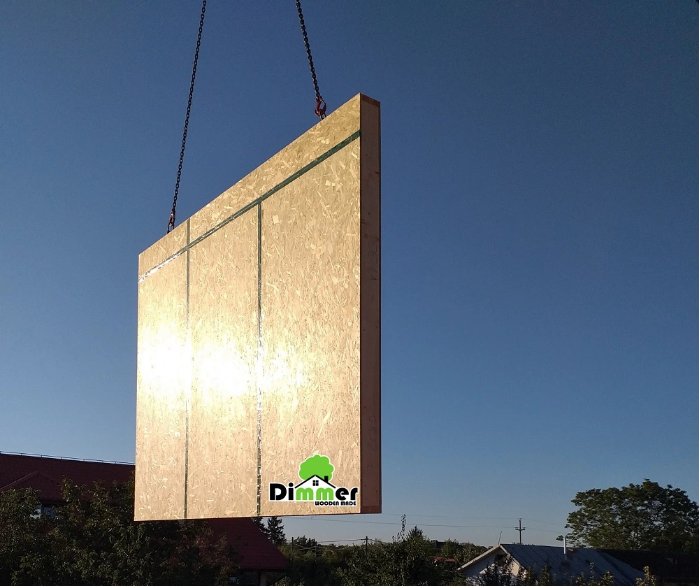 I.D. – Aici se vede structura unui perete interior, structura de lemn, izolația din vată, partea din interior placată cu OSB care realizează și contravântuirea pereților formând structura de rezistență. Urmează încă o placare cu pereți OSB.
